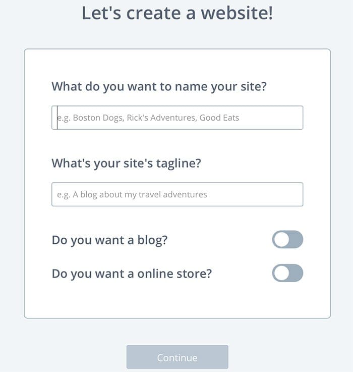 When logging in to the Bluehost portal for the first time you’ll be asked to name your site and add a tagline. If you don’t have a tagline, just describe in a few words what your blog is about. Click Continue.