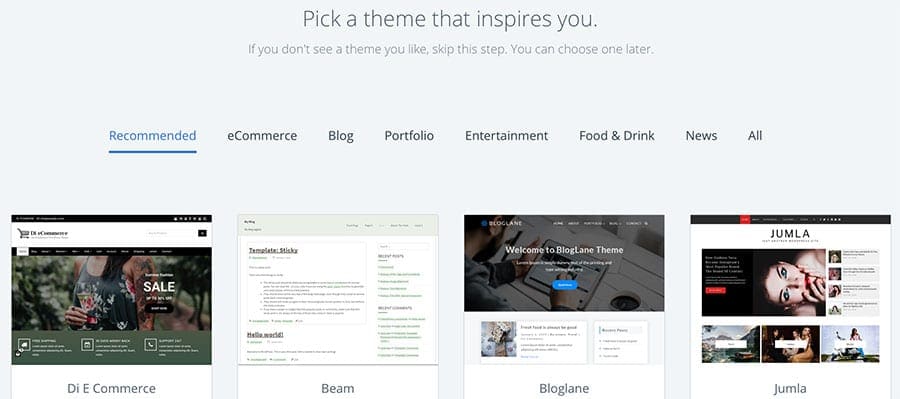 Next you can pick a WordPress theme. You can choose one of these free themes or you can scroll to the bottom and click skip this step if you want to install a premium theme. (I recommend using a premium theme as this will make your web design process a lot easier.